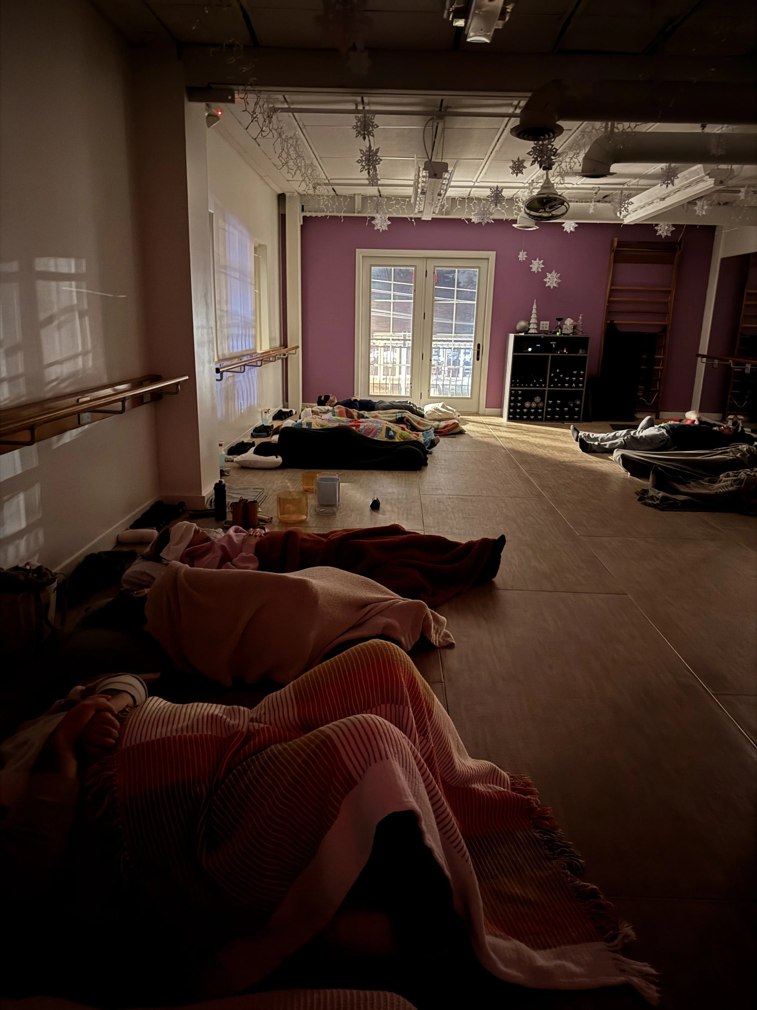 Most participants spend the session resting on the floor, either lying down or seated, supported with mats, blankets, and props.
